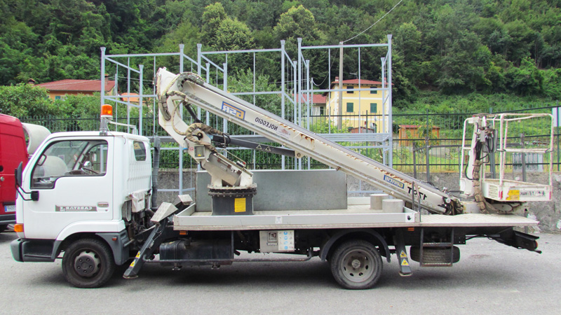 The truck with cherry picker allows a 360 ° rotation and a maximum arm extension of 15 meters and 8 meters horizontally. It's used to wire the poles, create overhead lines and lay lines to the wall.